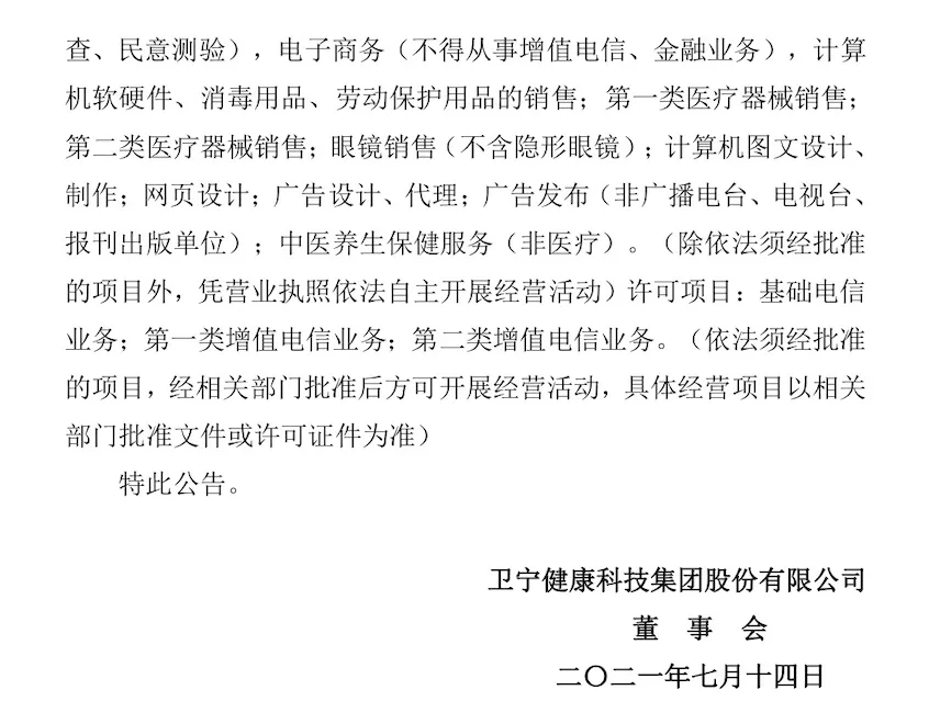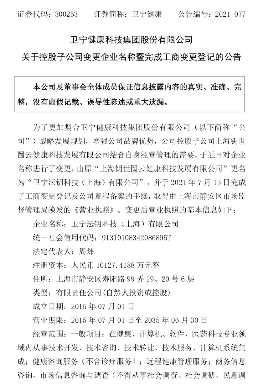 感谢您一直以来的信任和支持,为适应公司战略发展需要,经公司股东会研究决定并经上海市静安区市场监督管理局核准,公司原名称“上海沄钥科技云健康科技发展有限公司”于2021年7月13日正式更名为“卫宁沄钥科技(上海)有限公司”。